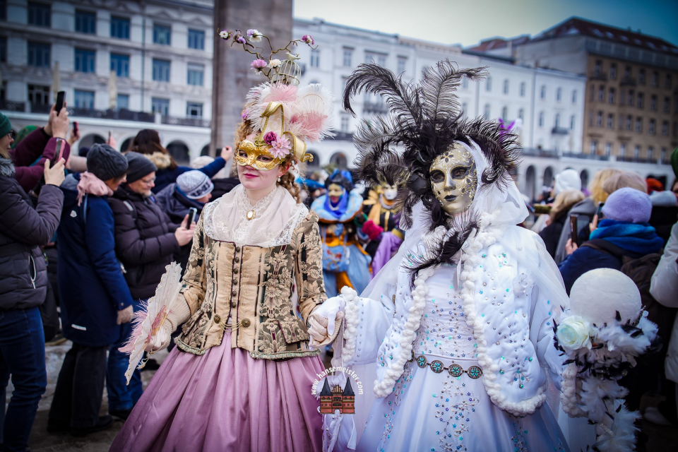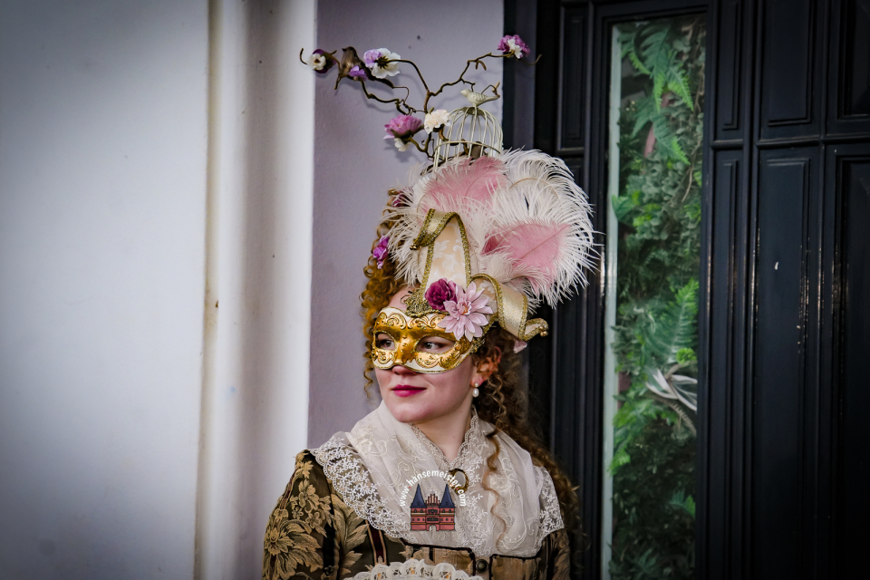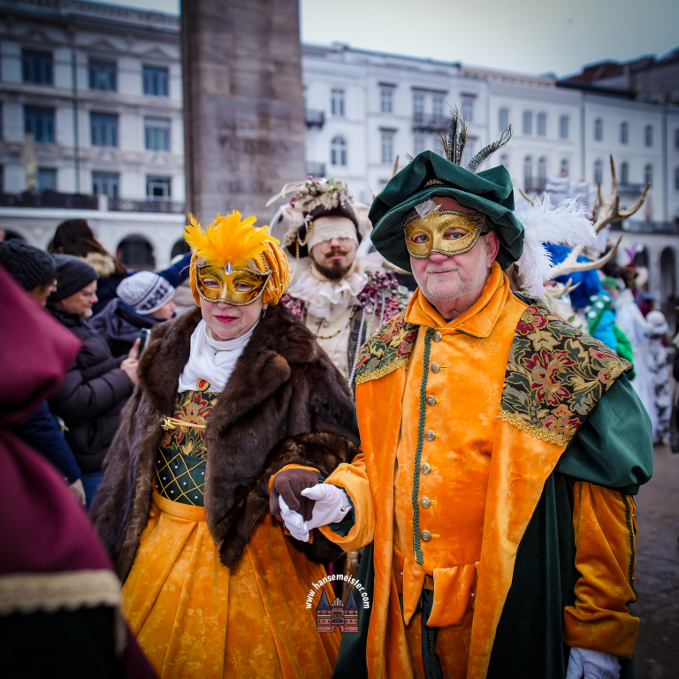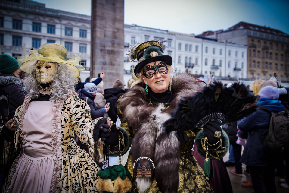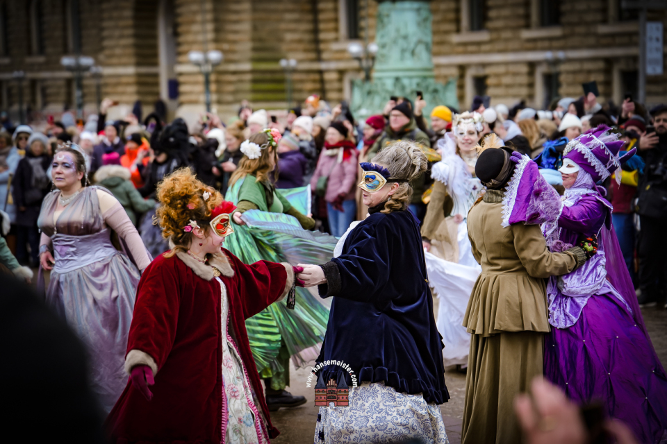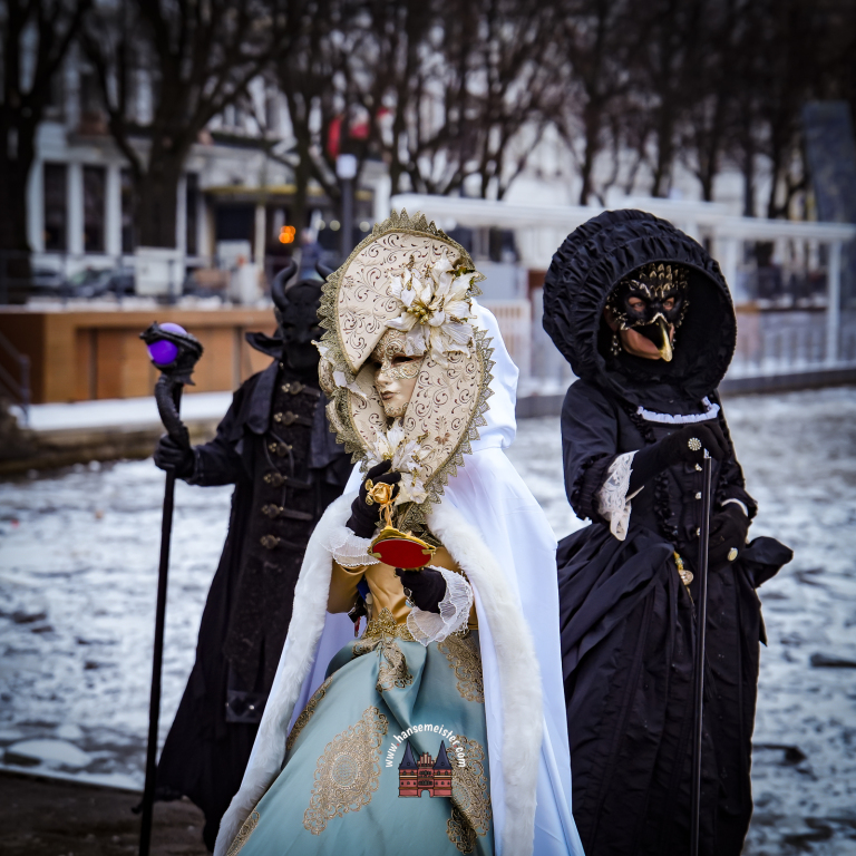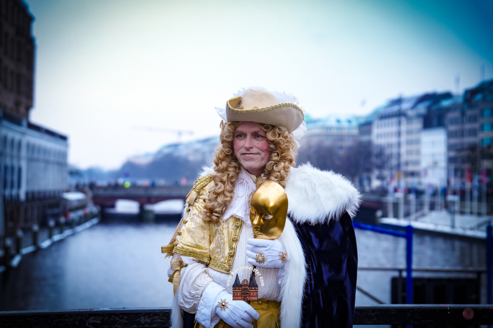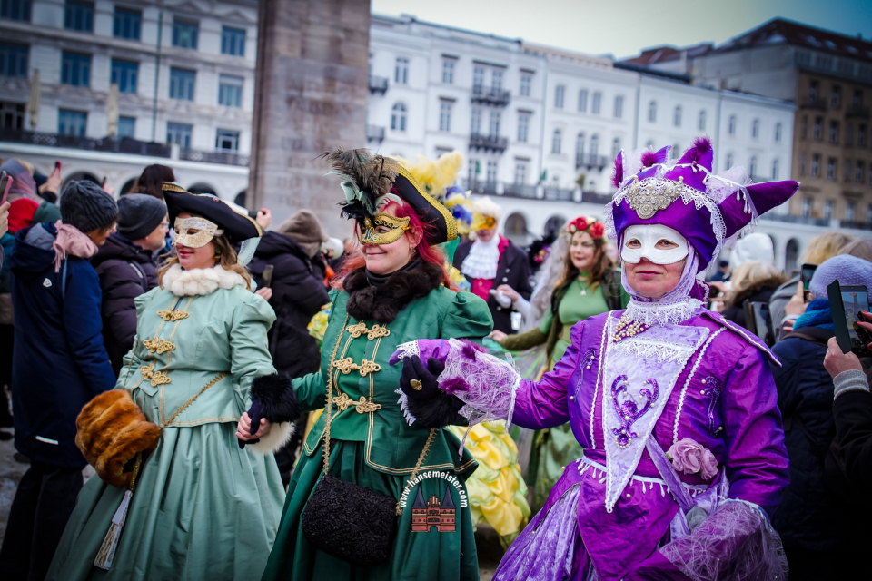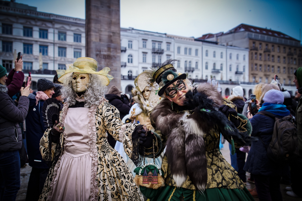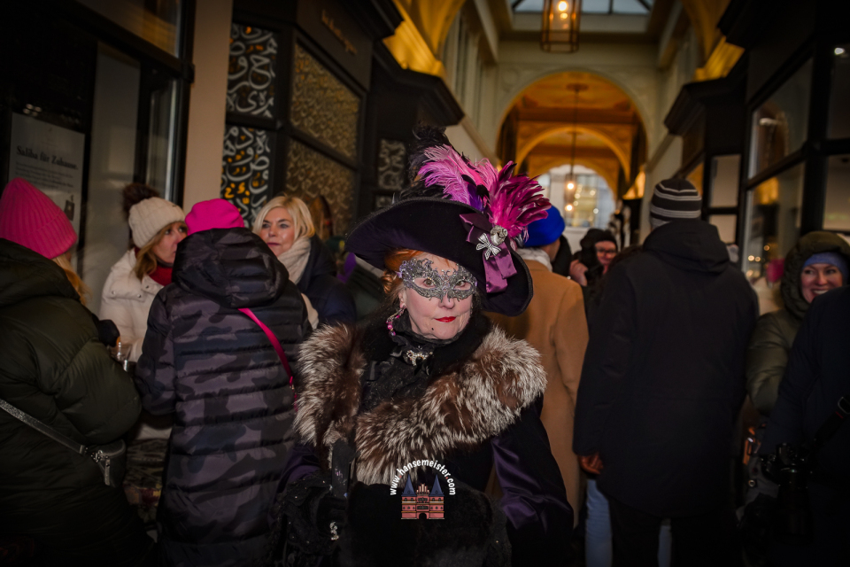 Bereits am späten Vormittag flanierten die prachtvoll gekleideten Damen und Herren durch die Colonnaden. Mit aufwendig gestalteten Masken, historischen Gewändern und detailreichen Accessoires entführten sie das Publikum optisch direkt nach Venedig. Die winterliche Kulisse Hamburgs verlieh dem Spektakel dabei einen ganz eigenen, besonderen Charme.