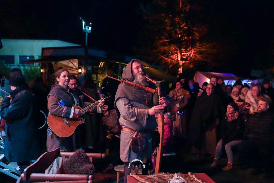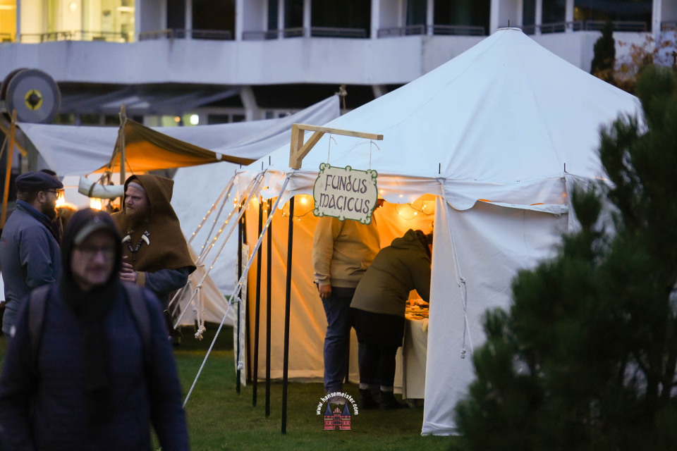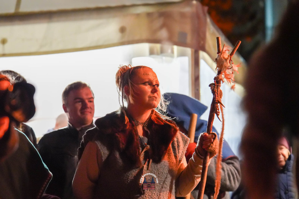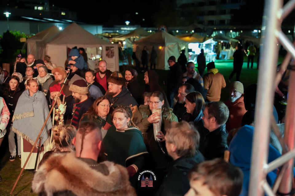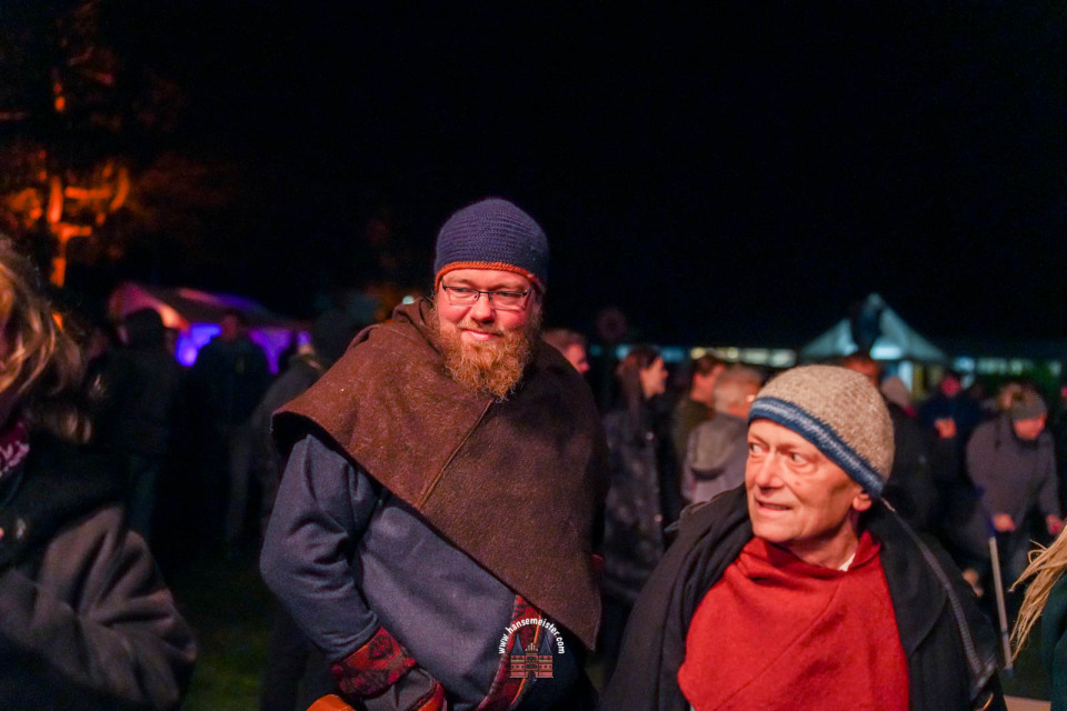 Bereits zum Einbruch der Dämmerung füllte sich das Gelände rund um die Bühne und den Marktbereich. Fackeln und Feuerstellen tauchten das Resort in warmes Licht, während Händler handgefertigte Waren, Met und herbstliche Spezialitäten anboten.