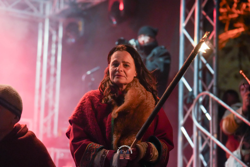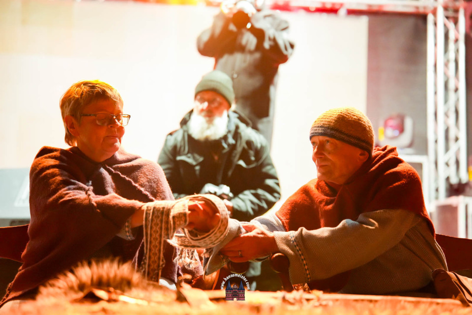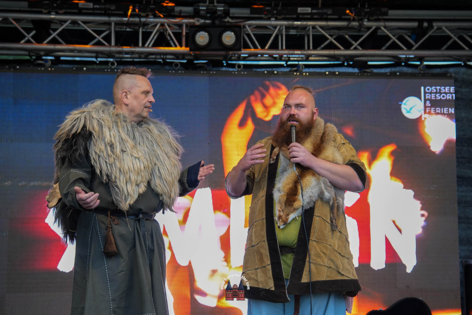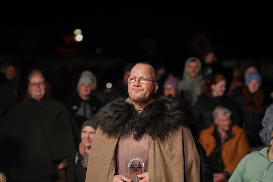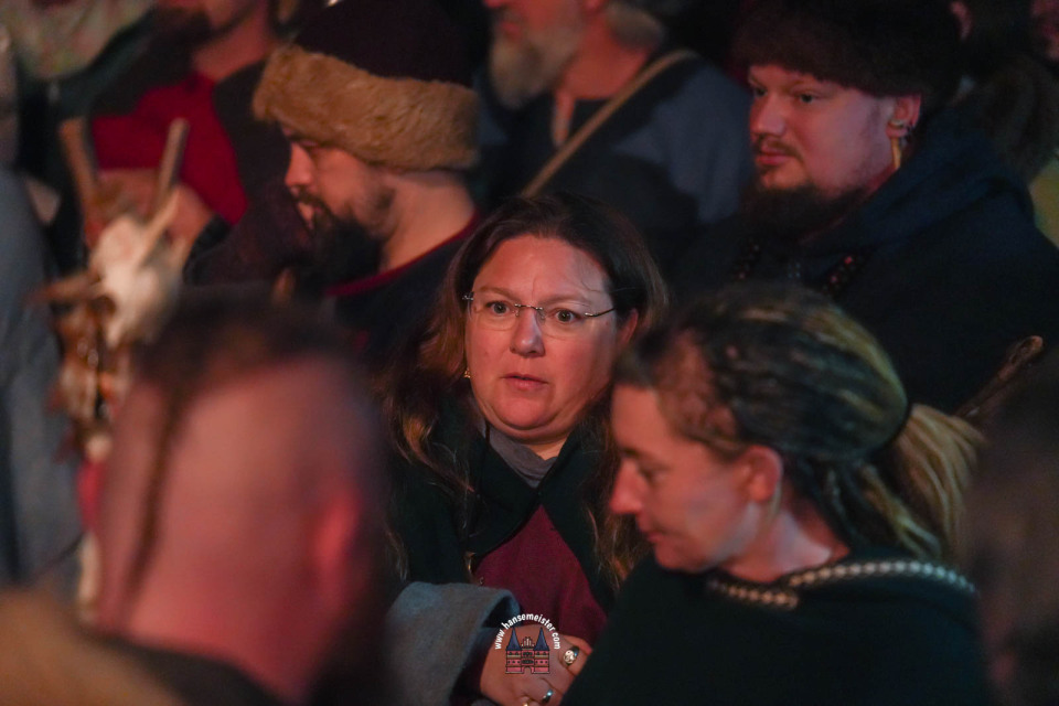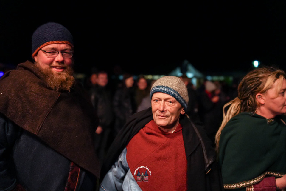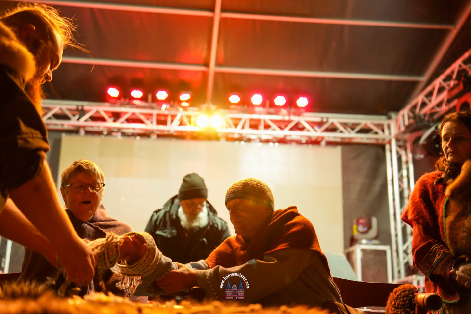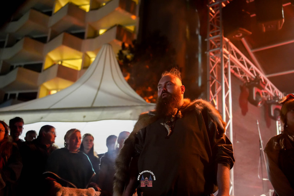 Ein besonderer Moment folgte direkt vor der Hauptbühne: Eine feierlich inszenierte Wikingerhochzeit zog die Aufmerksamkeit des Publikums auf sich. In historischer Gewandung gaben sich Karin und Met Ekki das Ja-Wort, begleitet von Musik von Frisia non Cantat und den Rufen der Menge. Der Flammenschein und die salzige Meeresluft machten die Zeremonie zu einem emotionalen Höhepunkt des Abends – kraftvoll, archaisch und zugleich zutiefst romantisch.