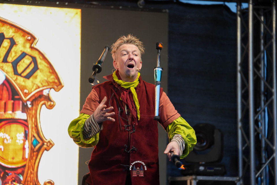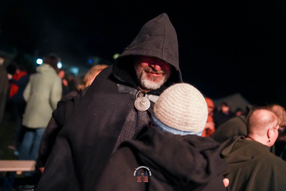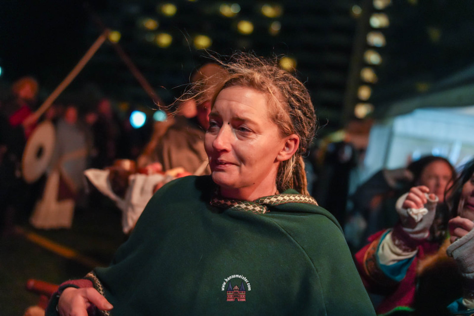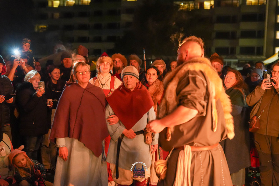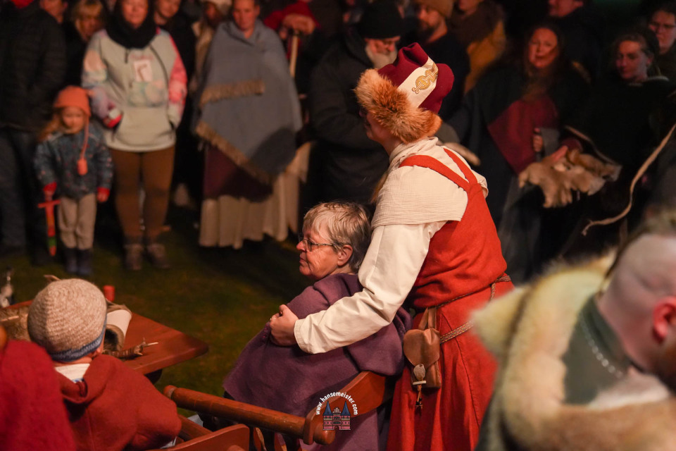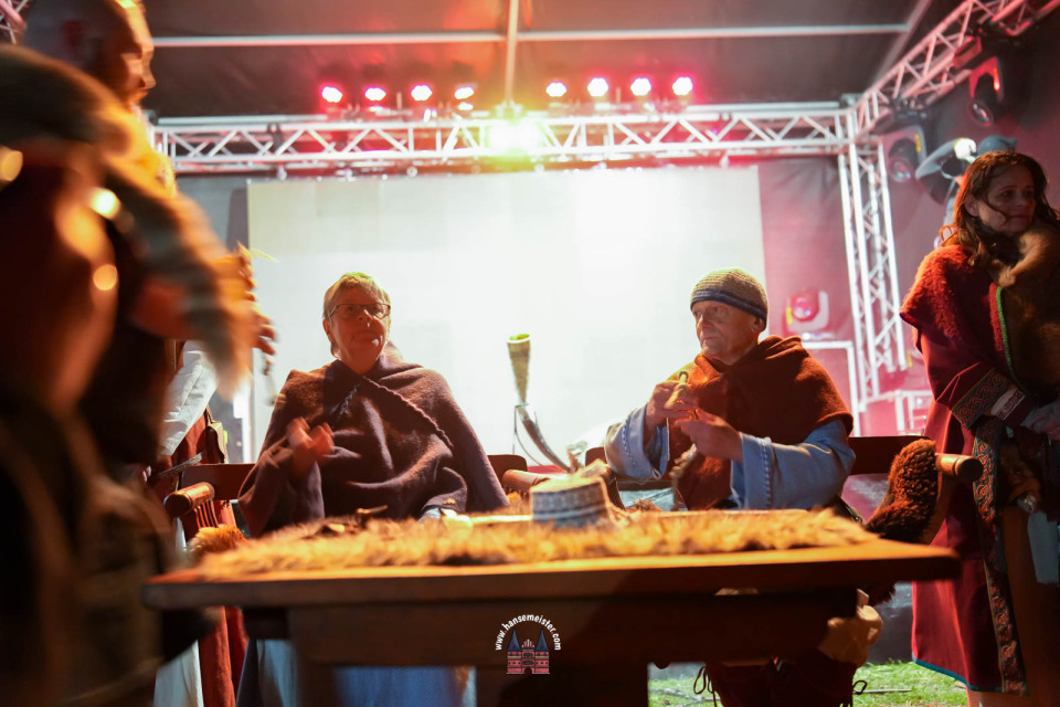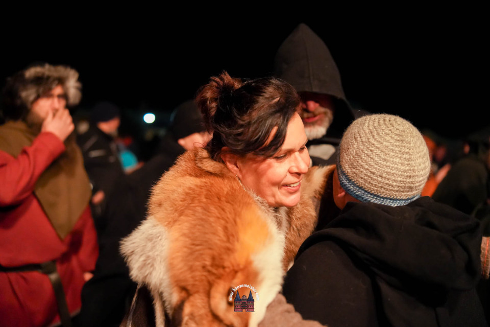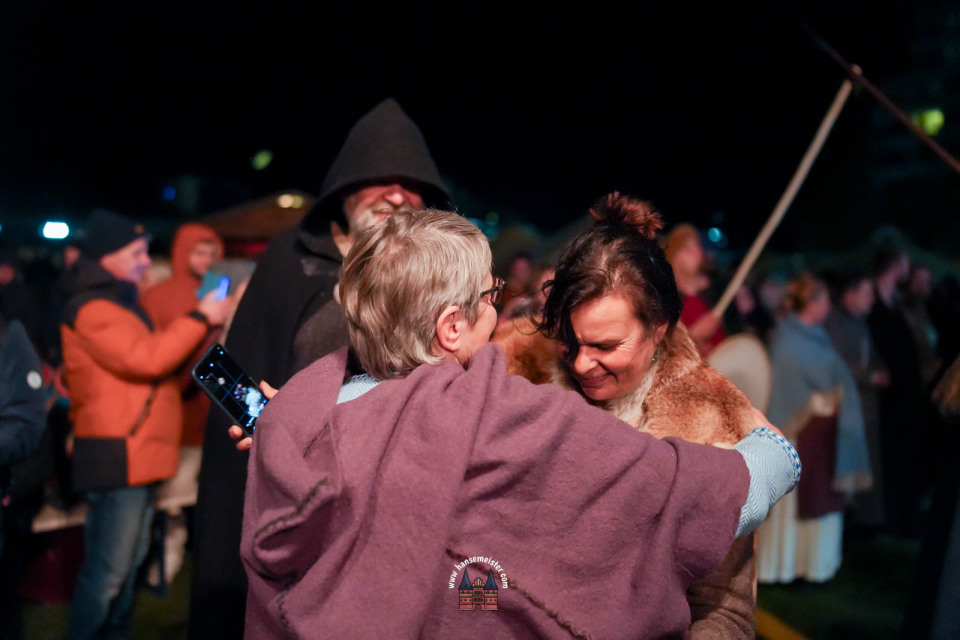 Ein besonderer Moment folgte direkt vor der Hauptbühne: Eine feierlich inszenierte Wikingerhochzeit zog die Aufmerksamkeit des Publikums auf sich. In historischer Gewandung gaben sich Karin und Met Ekki das Ja-Wort, begleitet von Musik von Frisia non Cantat und den Rufen der Menge. Der Flammenschein und die salzige Meeresluft machten die Zeremonie zu einem emotionalen Höhepunkt des Abends – kraftvoll, archaisch und zugleich zutiefst romantisch.